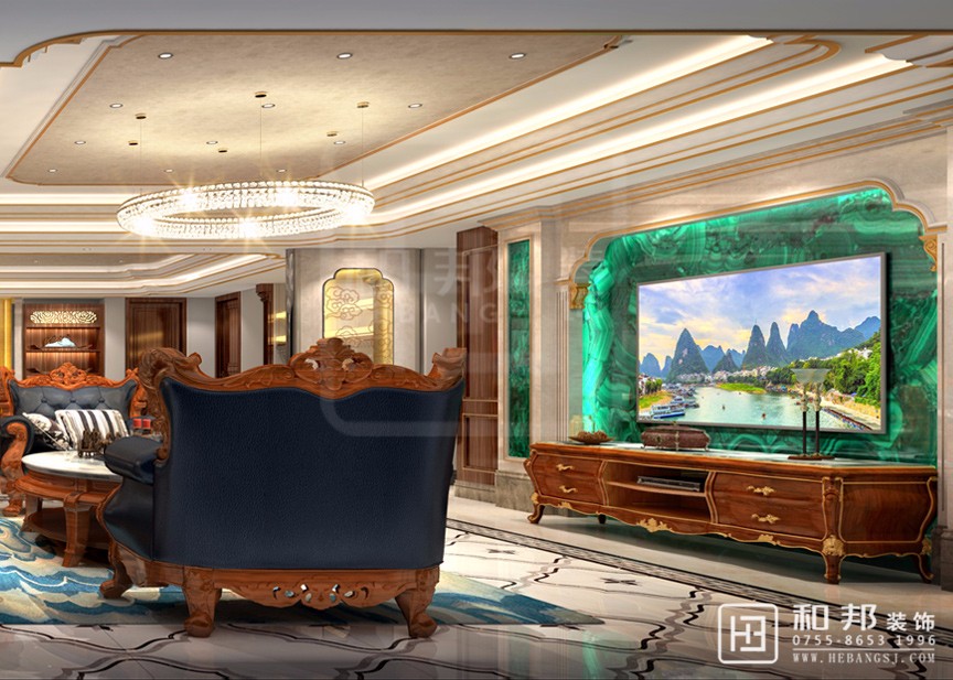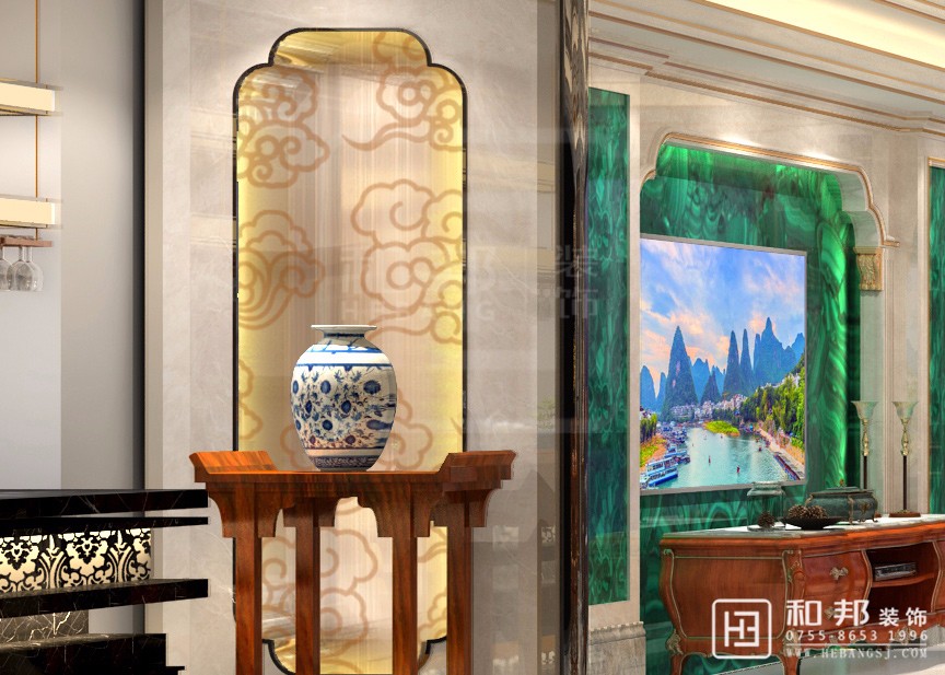 本案從孔雀綠玉石背景墻上彰顯出特意的設(shè)計質(zhì)感,也造就出深淺對比,層次有序的精致風華。