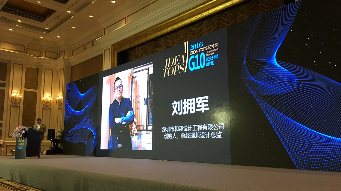 2016年國際空間設計大獎——艾特獎!G10設計峰會上,鑒于和邦裝飾劉擁軍先生在室內設計領域的突出表現(xiàn)和卓越成就,應邀參加了G10設計峰會圓桌會議,對【未來中國的室內設計方向探討】作了方向性的報告,得到了中外設計師從業(yè)者的高度贊揚。